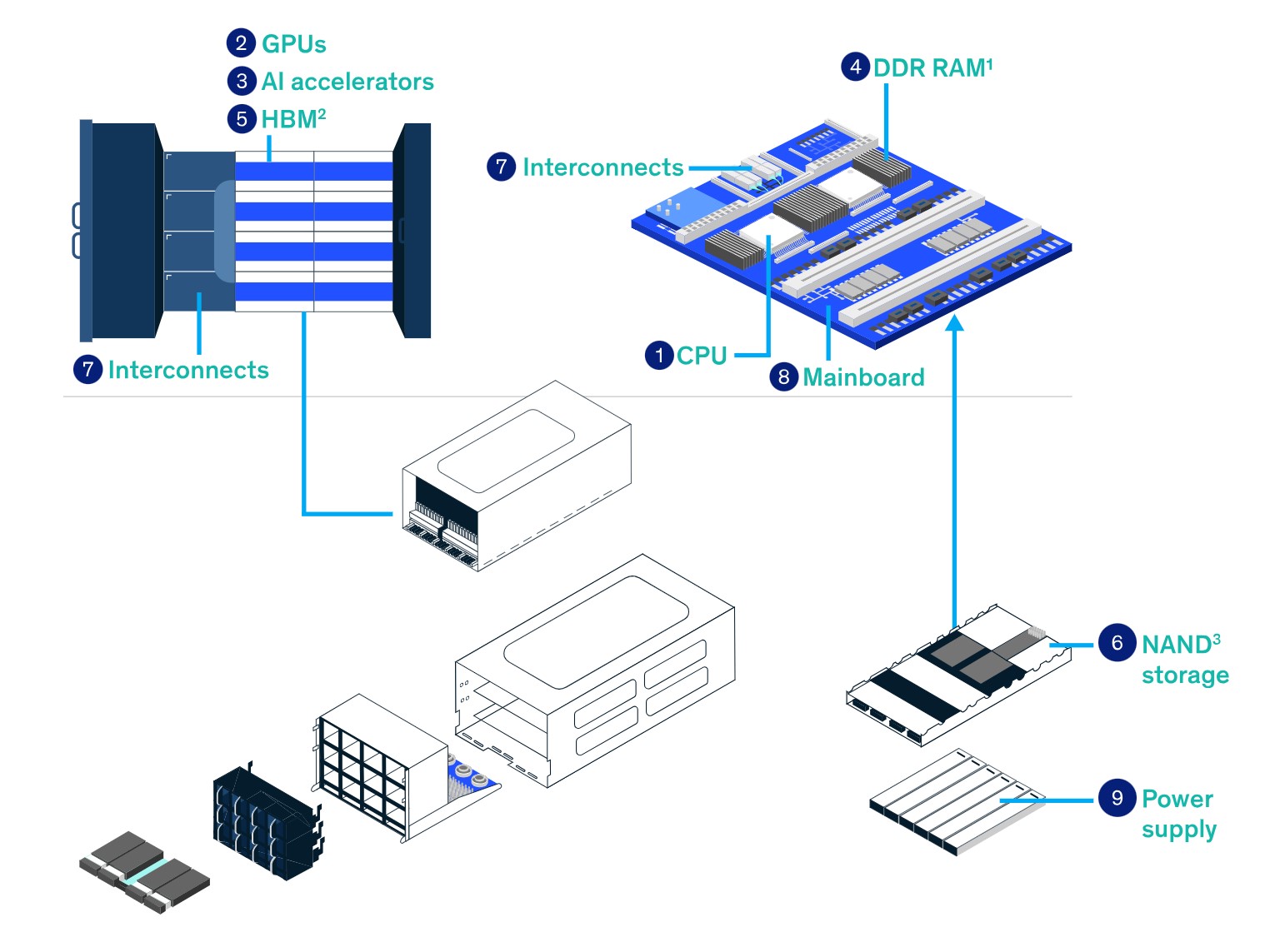 Серверы ИИ используют два типа оперативной памяти DRAM: HBM, подключенную к GPU или ускорителям, и оперативную память DDR, подключенную к CPU. HBM имеет более высокую пропускную способность, но требует больше микросхем для того же объема данных.