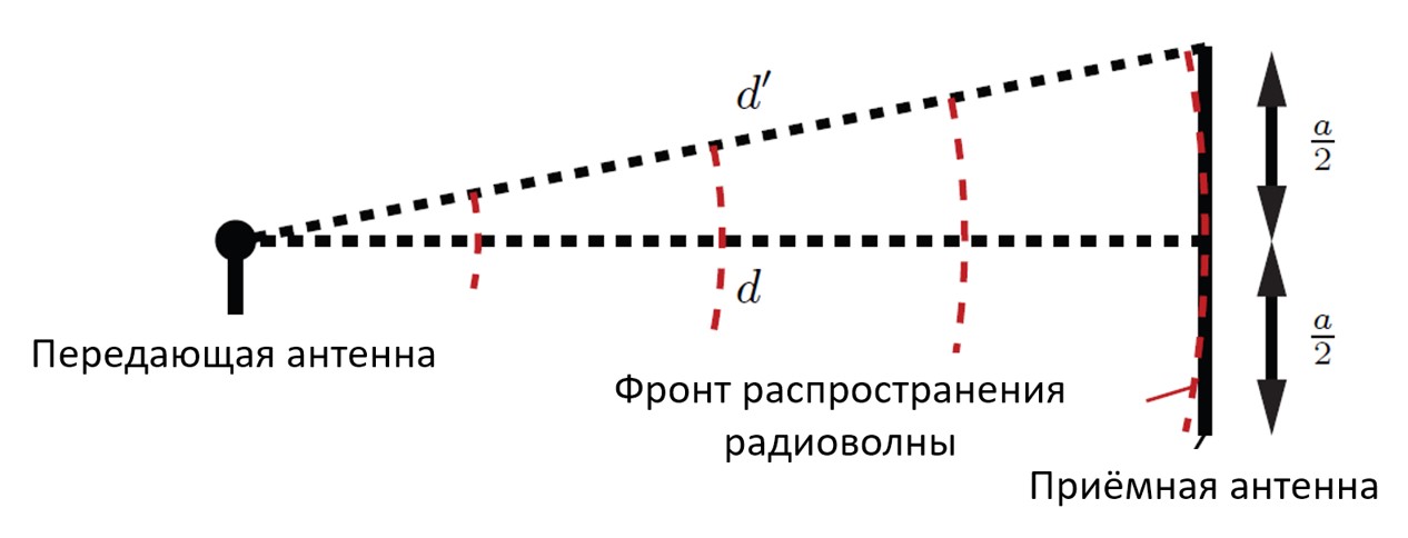 Не вдаваясь в подробности, можно показать, что этой разностью фаз вполне можно пренебречь, если расстояние между передающей и приёмной антеннами будет одновременно больше, чем 2a2/λ и 2a. Таким образом можно пренебречь сферической формой падающей на приёмную антенну радиоволны и вызываемой этой формой разностью фаз сигнала, падающего на центр приёмной антенны и её край.