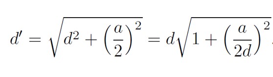Если расстояние от передатчика до центра антенны равно d, а ширина антенны равна a, то можно вычислить расстояние d’ от передатчика до краев антенны, используя теорему Пифагора, как: