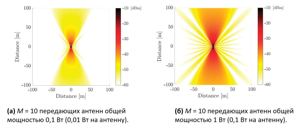 Предположим, мы хотим направить сигнал на пользователя, расположенного на вертикальной оси на рисунке 1 предыдущей публикации, а не на горизонтальной оси. Поскольку антенны в решетке разделены расстоянием λ/2, из тригонометрии следует, что каждый передаваемый сигнал смещается во времени на половину периода по сравнению с сигналом от соседней антенны. Следовательно, если мы излучаем сигнал, уже сдвинутый на половину периода, два эффекта компенсируются в каждой точке вертикальной оси. Результат показан на рисунке 1 ниже, где основные лучи направлены вдоль вертикальной оси, а компоненты сигнала компенсируются вдоль горизонтальной оси. За исключением углового поворота формирования диаграммы направленности, общее поведение такое же, как и раньше: формирование диаграммы направленности от M антенн может быть использовано для достижения того же отношения сигнал/шум, что и в случае с одной антенной, используя общую мощность передачи в M раз меньшую (как на рисунке 1(a) ниже) или добиться более высокого отношения «сигнал/шум» в M раз (как на рисунке 1(б) ниже), используя ту же общую мощность.