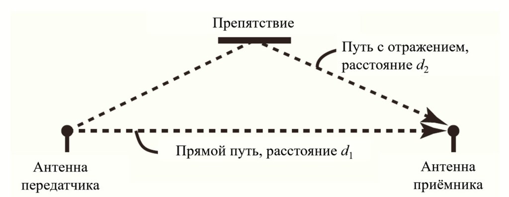 Предположим, что передатчик излучает чистый синусоидальный сигнал x(t) = sin(2πft), где f — частота. Сигнал достигает приёмной антенны по двум путям, как показано на рис. 1 ниже: прямой путь имеет расстояние d1, а отражённый путь имеет расстояние d2.