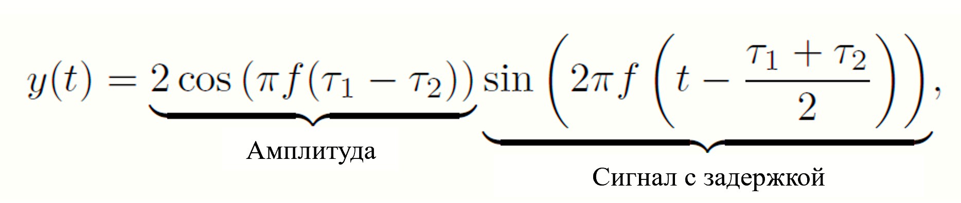 где каждое слагаемое называется компонентом многолучевого распространения. В зависимости от соотношения временных задержек τ1 и τ2 два луча (компоненты), прямой и отражённый, в (1) могут либо усиливать, либо нейтрализовывать друг друга. Используя правила тригонометрии[1], можно переписать (2) в виде произведения амплитуды на синусоидальную функцию сигнала с задержкой (τ1 + τ2):