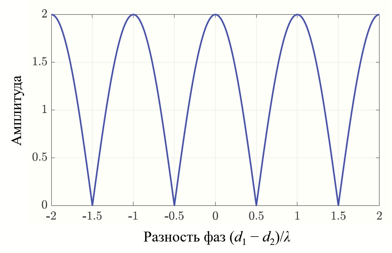 Заметим, что здесь амплитуда имеет знак (+ или −) и может принимать любое значение от −2 до +2 в зависимости от аргумента косинуса. Сравнивая эту амплитуду с единичной амплитудой, полученной только при прямом пути, мы замечаем, что при многолучевом распространении сигнал может либо усиливаться, либо затухать. В частности, если (d1 − d2)/λ — целое число, то выражение (4) становится равным ±2, и мы получаем выгоду от наличия двух путей, получая удвоенную амплитуду. Это происходит потому, что сигналы, полученные по двум путям, имеют одинаковые фазы.