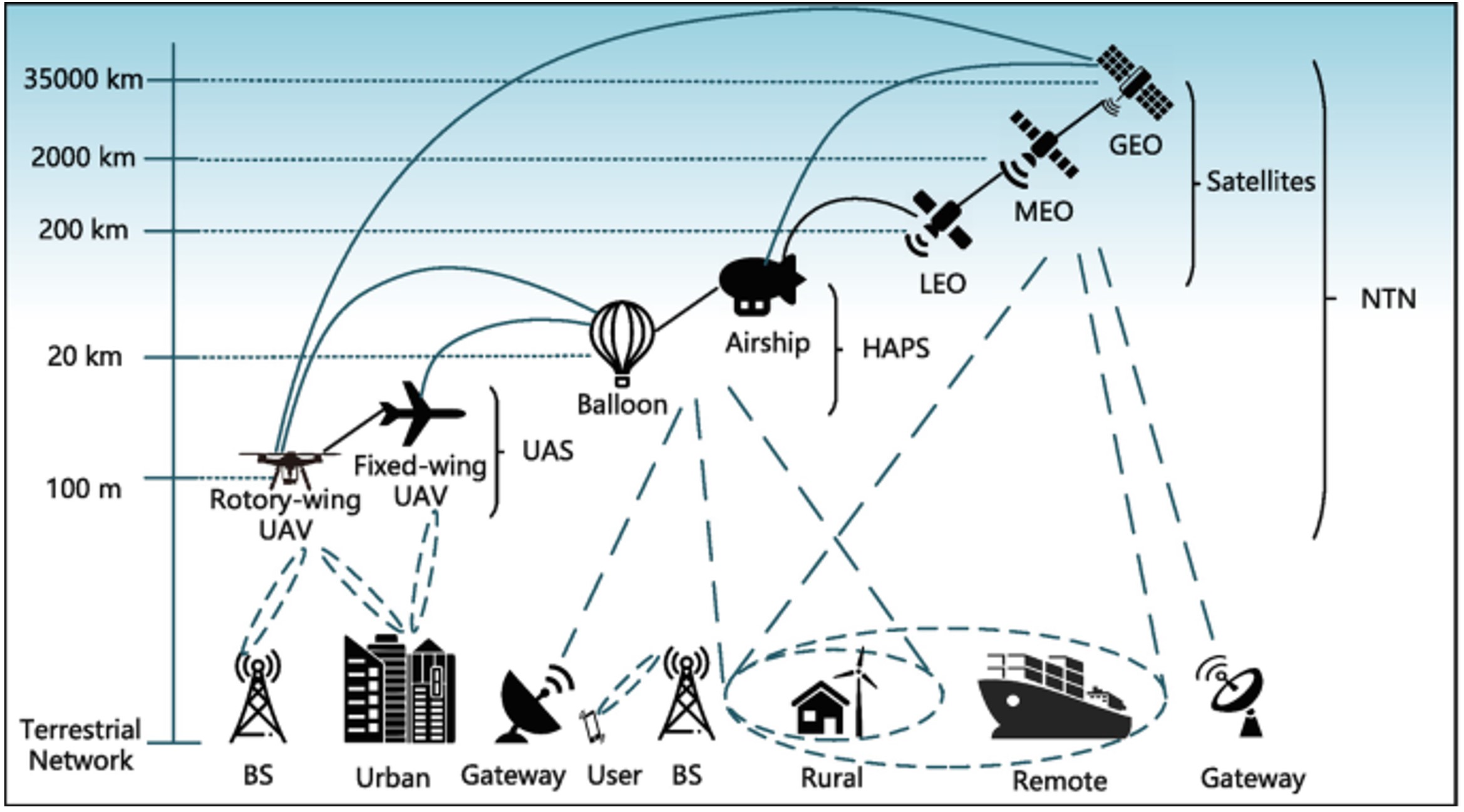 NTN будут содержать дополнительные сегменты космических и воздушных сетей связи, включая спутниковые группировки GEO, MEO и LEO, системы высотных платформ HAPS (High Altitude Platform Systems), системы маловысотных платформ (LAPS) и сети «воздух-земля» A2G (Air-To-Ground)).