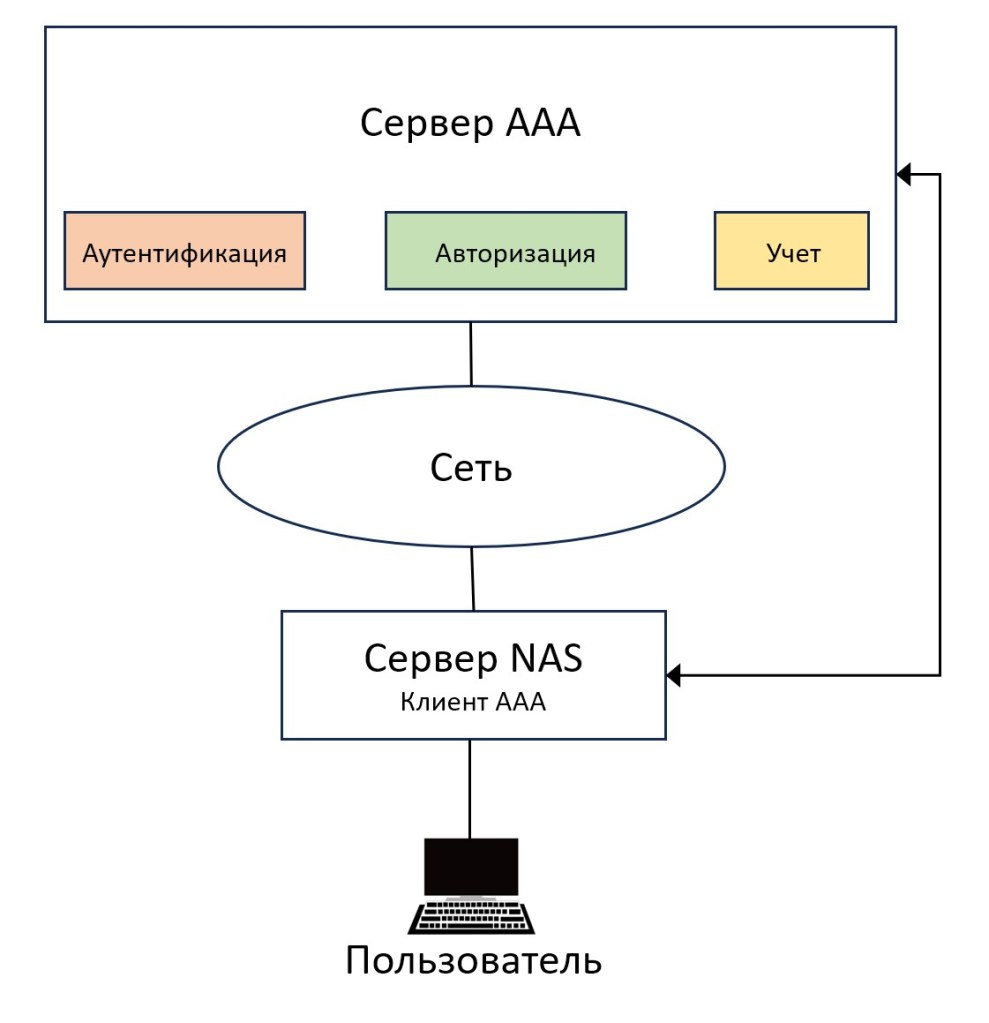 Решение аутентификации, авторизации и учета AAA (Authentication, Autorization, Accounting) заключается в решении этих задач максиммально простым и масштабируемым образом. На практике сервер AAA с базой данных профилей пользователей и данными конфигурации взаимодействует с клиентами AAA, находящимися на сетевых элементах, таких как сервер доступа к сети NAS (Network Access Server) и маршрутизаторы, для предоставления распределенных услуг AAA.