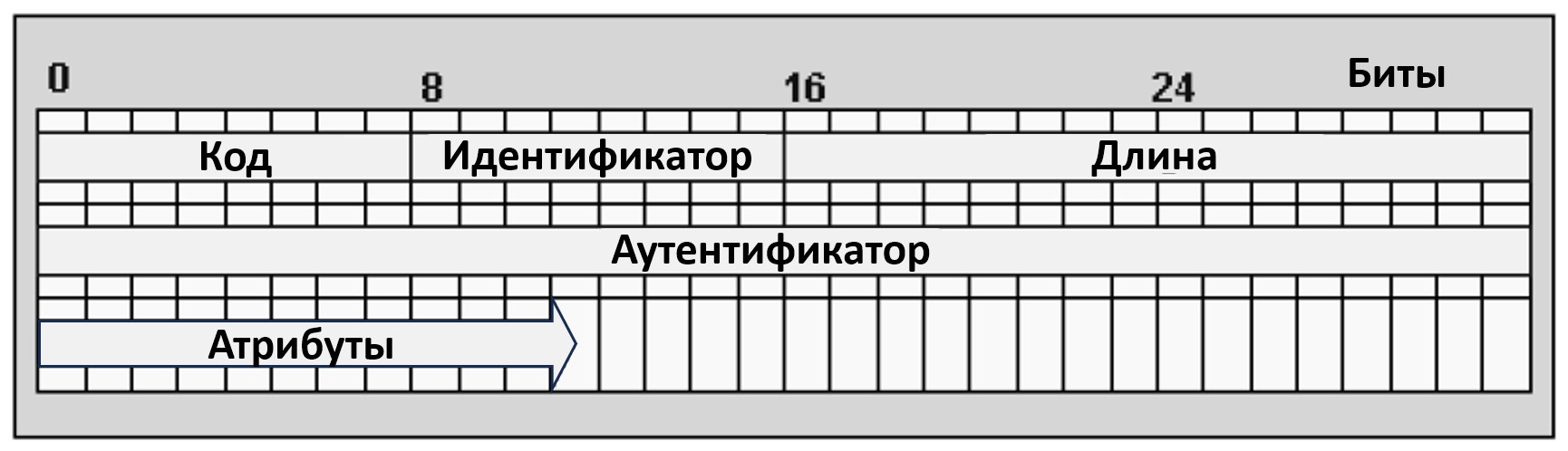 - Поле аутентификатора длиной 32 бита (Authenticator), которое используется для аутентификации ответа от сервера RADIUS, а также используется как часть алгоритма для сокрытия пароля клиента при запросах.